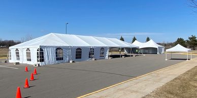 The most common size is a 20 foot x 20 foot frame tent (pictured) or about the size of a standard 2-car garage. A frame tent is easier to setup than other types and does not require a center pole. Other sizes available based on the number of guests expected. We can set it up for you or we have options that customers can set up.